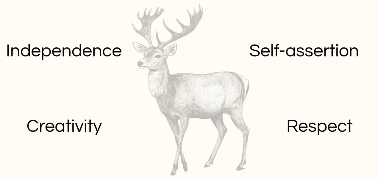 The Deer is one of those strong majestic creatures that have powerful symbolism. It embodies creativity, independence, enlightenment and pride. The Deer's antlers signify the ability to be assertive in one's surroundings. People who are related to the Deer carry the innocence of their inner child within them. You can combine gentleness, determination and strength. The wisdom of the Deer totem reminds you to be peaceful and gentle with yourself and others. You often trust your instincts and see the good in people. When you're unaccompanied, you take the time to be alone and enjoy the peace and quiet. With horns that form a crown, the Deer is an animal that inspires dominance with poise and confidence. Determined but also gentle, it commands respect rather than fear.